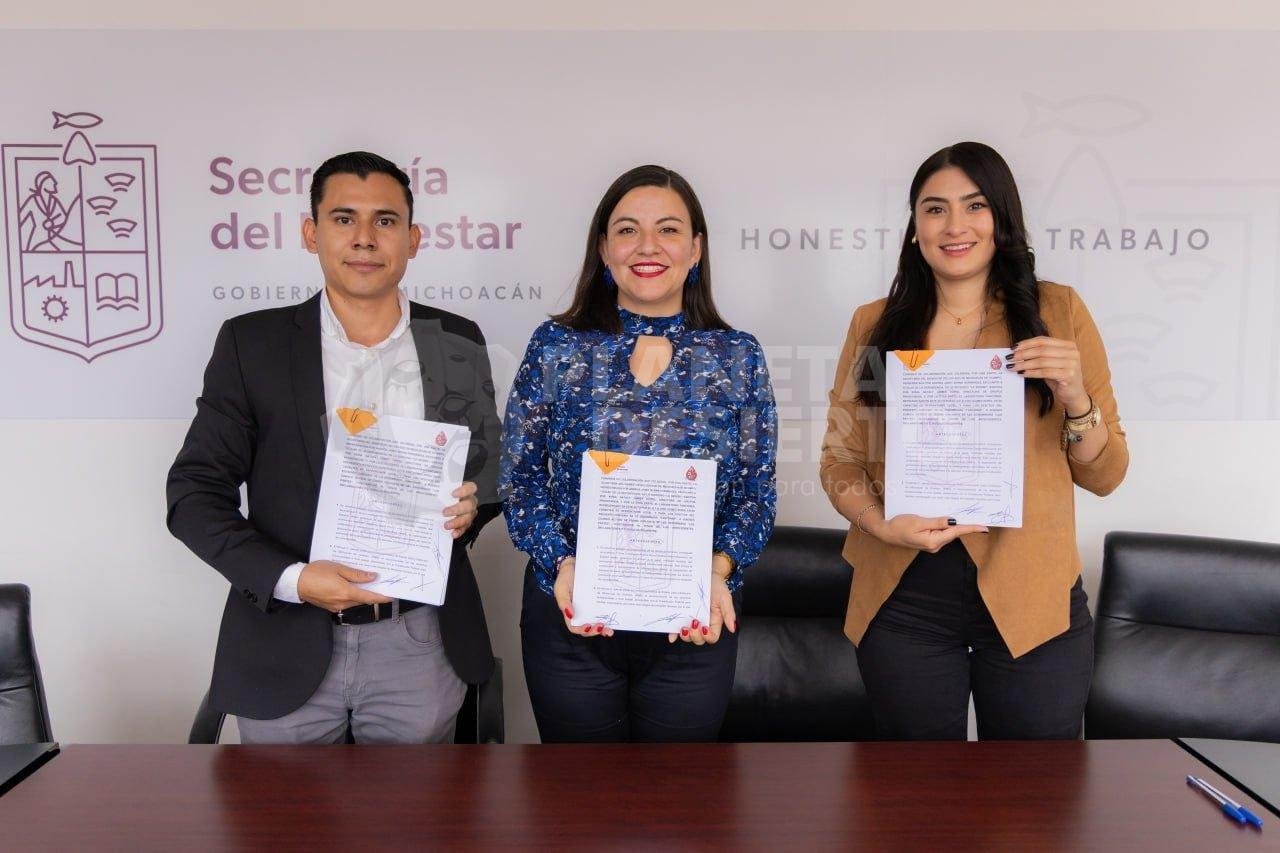 La titular de la Sedebi, Andrea Serna Hernández y Erik Gómez Soria, representante legal del laboratorio, así como Kenia Nataly Jaimes Huipio, directora de Atención a Grupos Prioritarios, acordaron que este beneficio será de manera directa a las y los beneficiarios de los programas Mujeres con Cáncer de Mama y/o Cervicouterino Invasor y Familias Cuidadoras de Niñas y Niños con Cáncer.