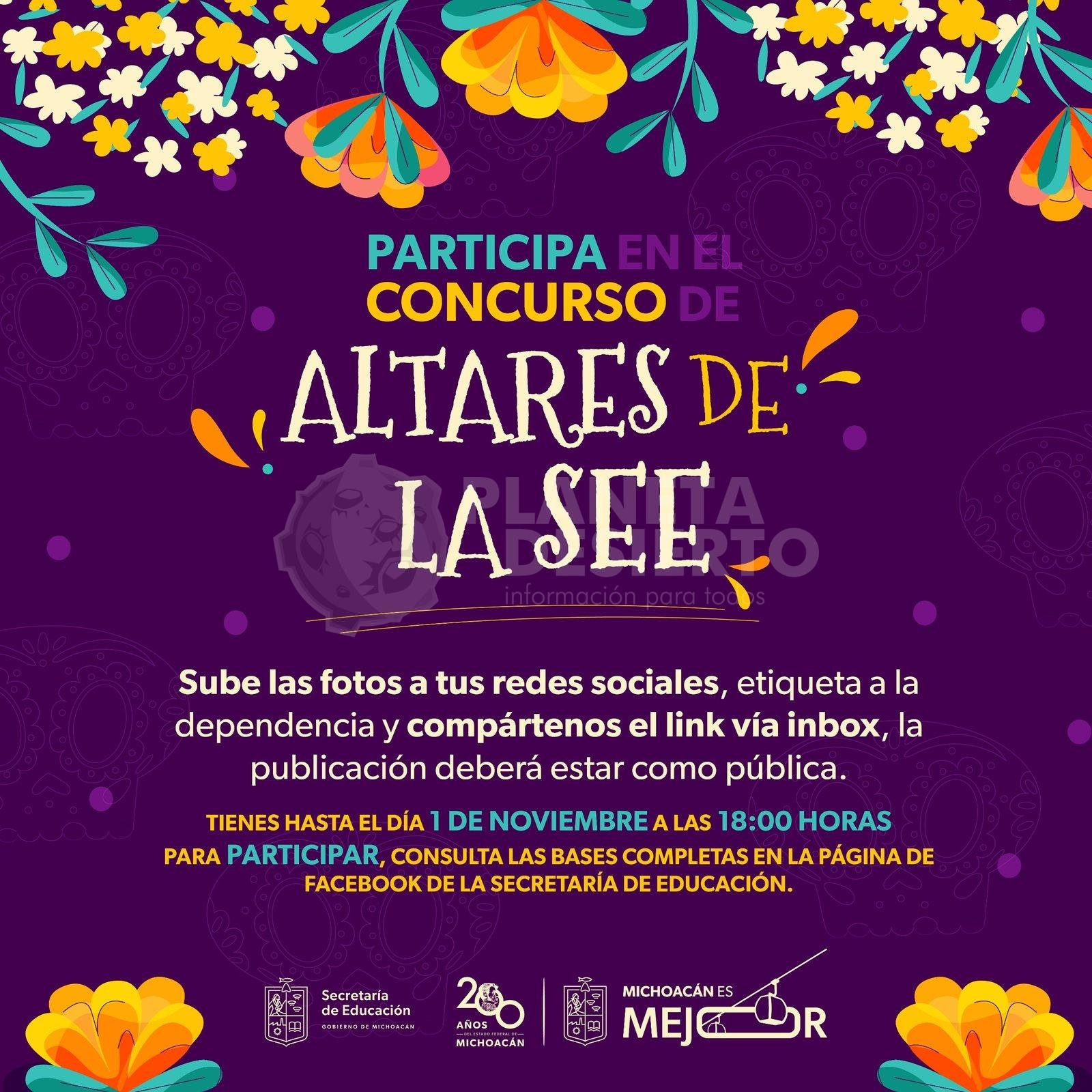 Para participar, tienes que hacer lo siguiente: publica las fotos de tu altar escolar en tus redes personales, de docentes o de la escuela, arrobando a la Secretaría de Educación del Estado de Michoacán, asegura que la configuración de visualización sea pública y envía el link de la publicación vía inbox a la página de la SEE.