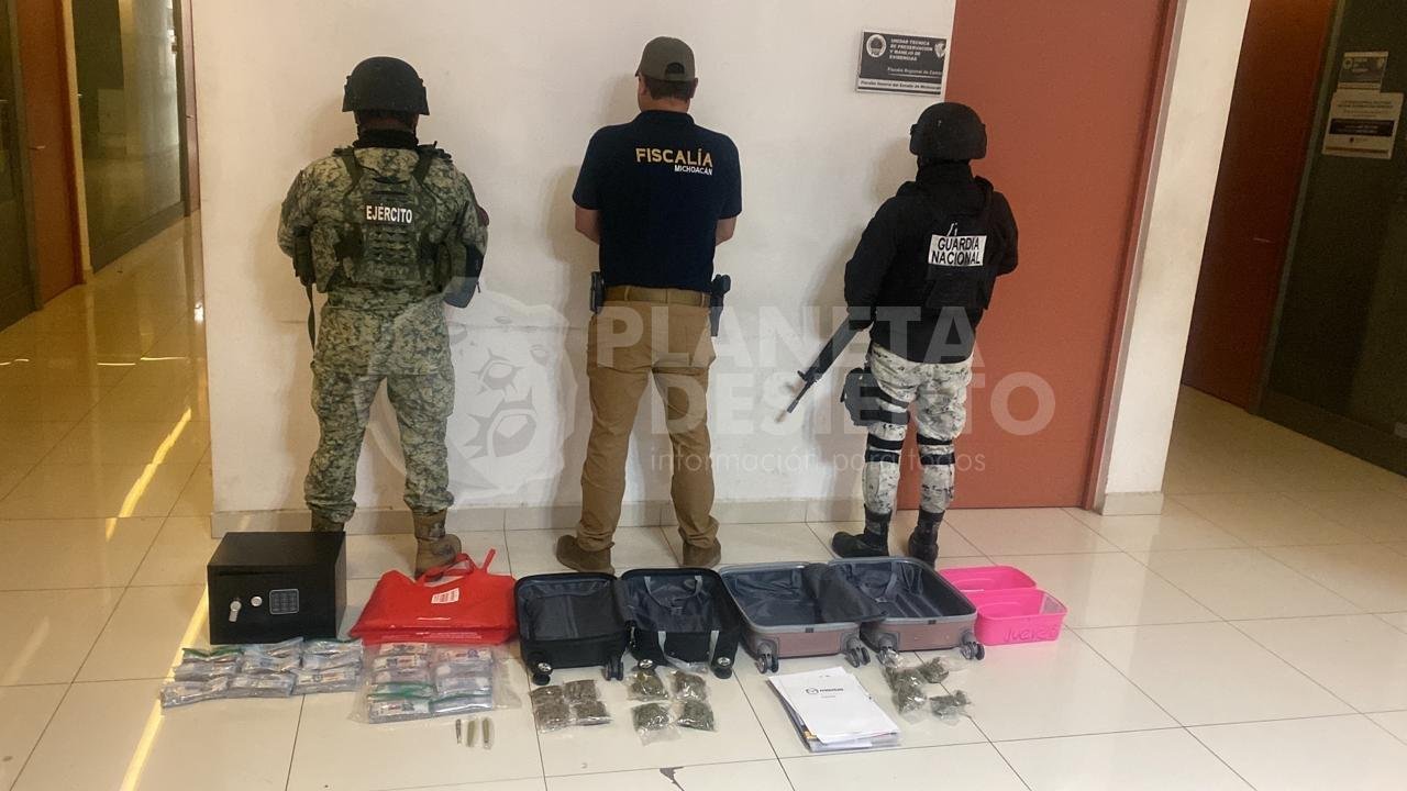 Jacona, Mich.- 13 de febrero de 2026.- En el marco del Plan Michoacán por la Paz y la Justicia, en labores interinstitucionales la Fiscalía General del Estado de Michoacán (FGE) ejecutó una orden de cateo en un inmueble del fraccionamiento Manantiales de Curutarán, en el municipio de Jacona, que derivó en el aseguramiento de 1 millón 450 mil pesos en efectivo, así como diversos indicios relacionados con actividades ilícitas.