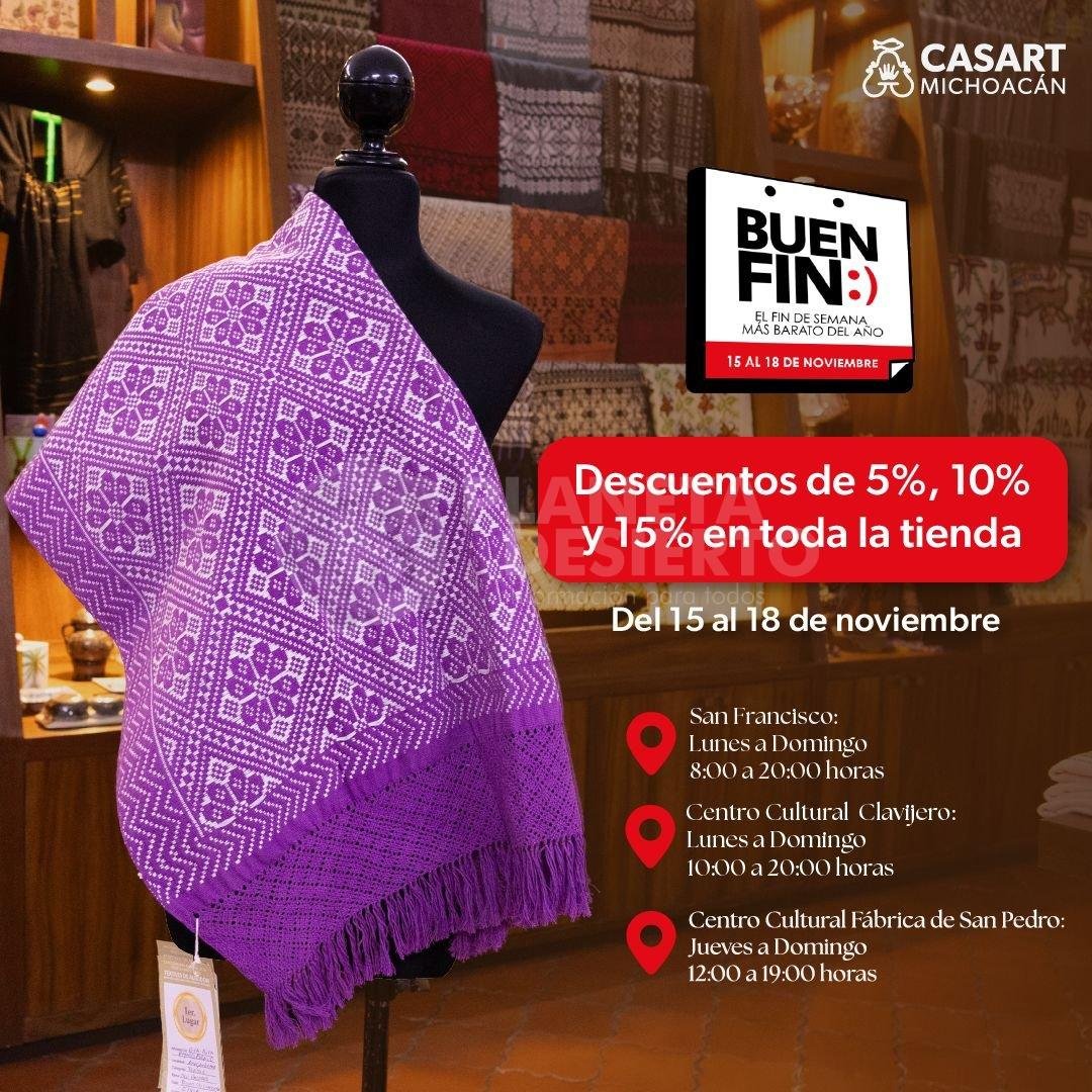 Morelia, Michoacán, 13 de noviembre de 2024.- El Buen Fin llega a Casa de las Artesanías (Casart) con descuentos del 5, 10 y 15 por ciento en todas las piezas, del 15 al 18 de noviembre.