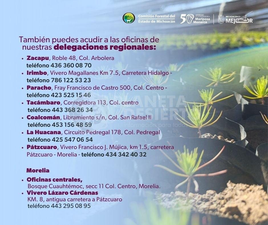 Por ello, la Cofom invita a la sociedad, y especialmente a propietarios de ejidos o terrenos forestales afectados por incendios o plagas, a sumarse a las reforestaciones de este año. Para más información pueden acudir a las oficinas centrales ubicadas en Justo Mendoza lote 11, Bosque Cuauhtémoc, en Morelia; o comunicarse al teléfono 443 312 3930.