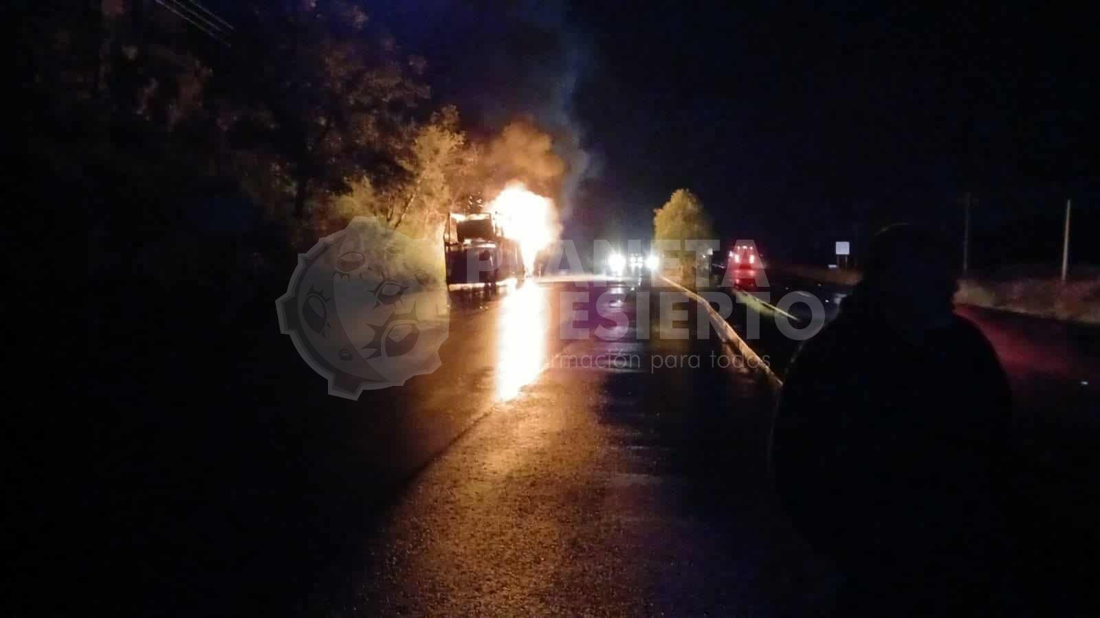 Lagunillas, Mich.- 08 de octubre de 2025.- El remolque de un camión tipo nodriza, cargado con vehículos nuevos, ardió en llamas debido a una aparente falla sobre la carretera Morelia – Pátzcuaro, sin que hubiera victimas que lamentar.