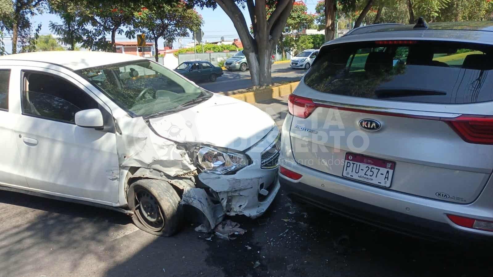 Morelia, Mich.- 5 de noviembre de 2025.- Un automóvil chocó contra un objeto fijo y después se impactó levemente contra el costado de otro vehículo sobre el Libramiento Sur de Morelia, a la altura de la colonia Nueva Jacarandas, hecho que sólo dejó daños materiales, comentaron fuentes policiales.