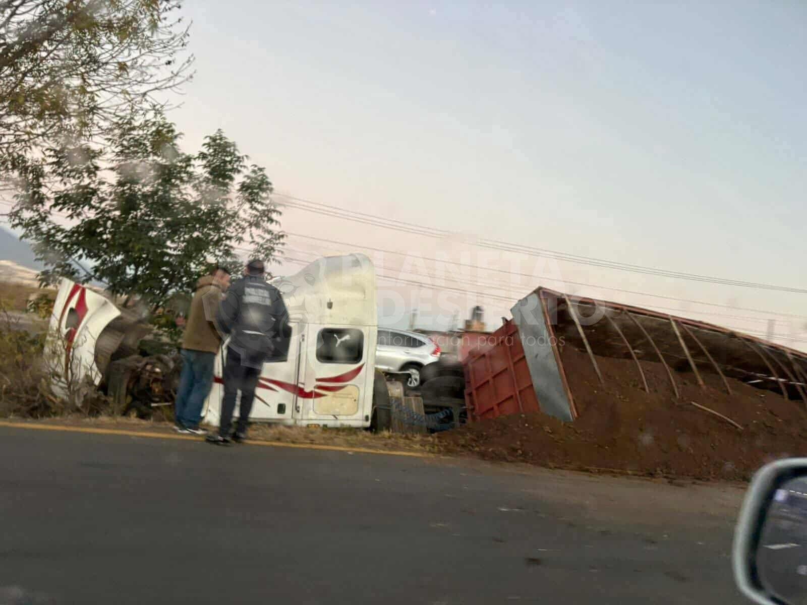 Morelia, Mich.- Martes 03 de febrero de 2026.- Un trailer quedó parcialmente volcado tras caer a una cuneta central de la carretera Morelia-Pátzcuaro, indicaron autoridades policiales, las cuales mencionaron que únicamente hubo daños materiales.
