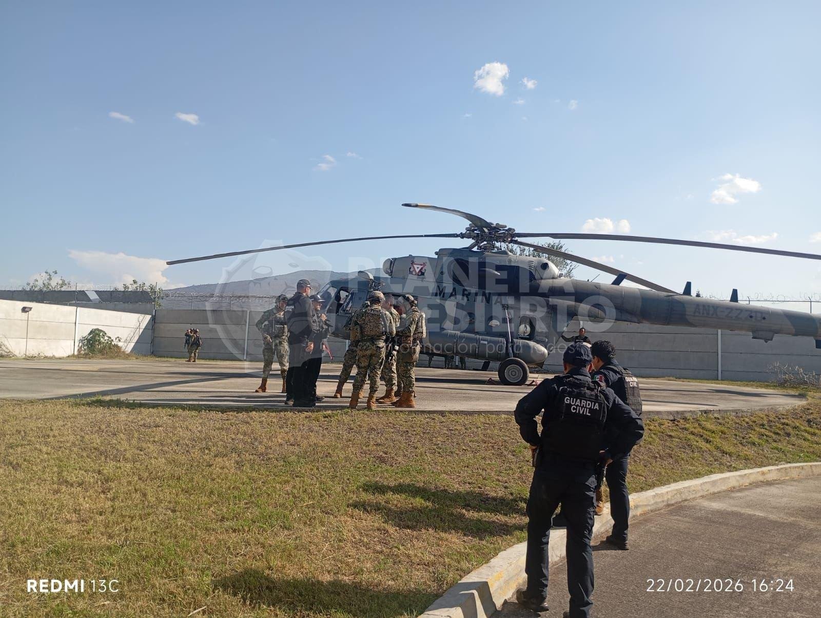 Morelia, Michoacán, 22 de febrero de 2026.- Como parte del reforzamiento a la estrategia de seguridad en la región Jiquilpan, se incorporaron elementos especializados de la Secretaría de Marina (Marina), así como un helicóptero artillado para brindar cobertura aérea, además del despliegue de efectivos del Ejército Mexicano que ya operan en la zona.