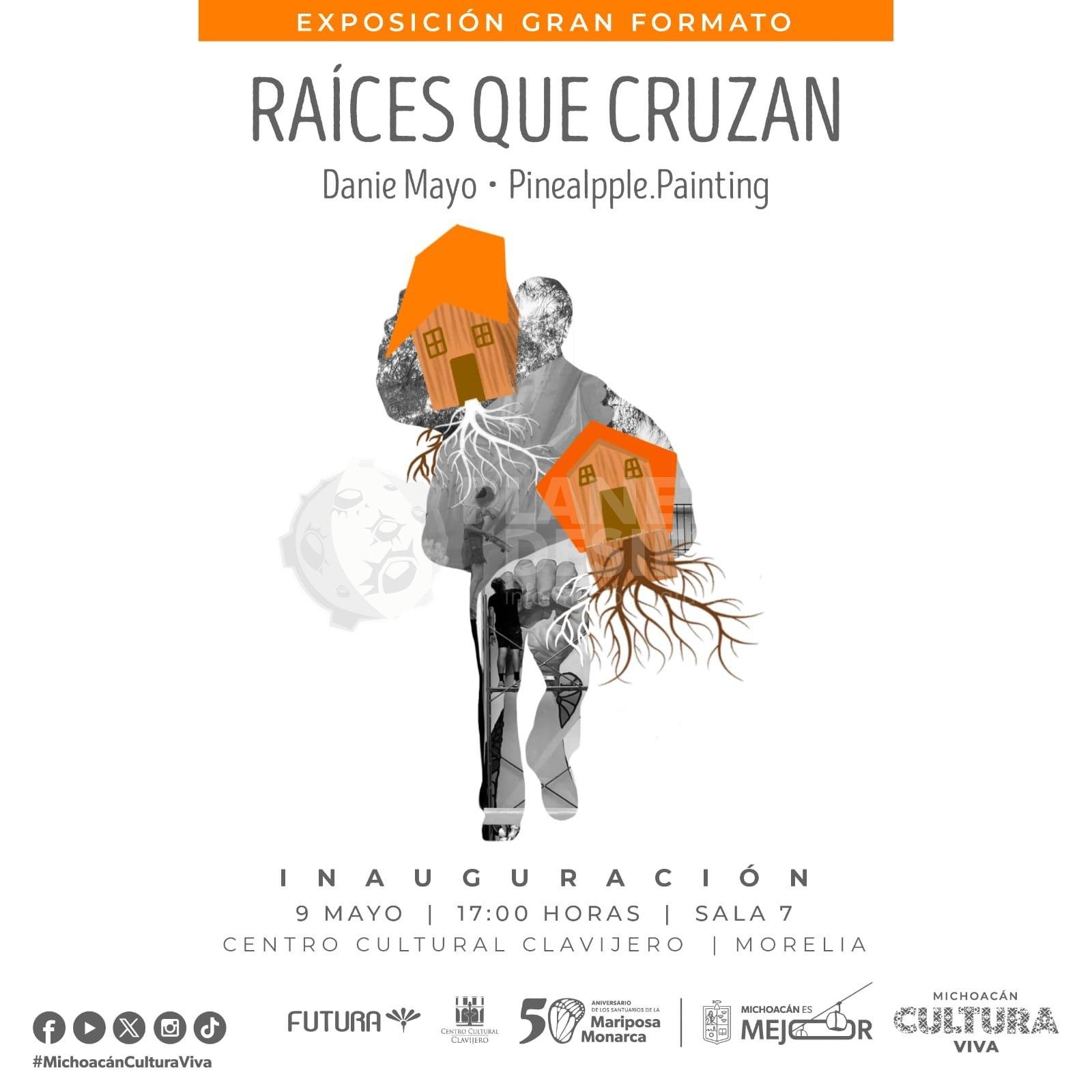 Morelia, Michoacán, 6 de mayo de 2025.- La Secretaría de Cultura de Michoacán y Futura A.C. invitan a la inauguración de la exposición “Raíces que Cruzan”, de la muralista Danie Mayo y el artista urbano Pinealpple. Painting, el próximo 9 de mayo a las 17:00 horas en la Sala 7 del Centro Cultural Clavijero (CCC).