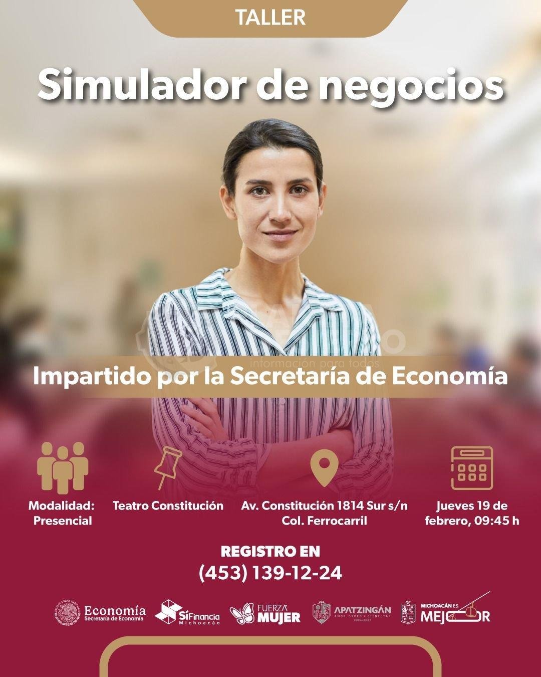 Por otro lado, en Apatzingán, el jueves 19 de febrero, a las 9:45 horas, en el Teatro Constitución, ubicado en avenida Constitución 1814 Sur s/n, colonia Ferrocarril, se efectuará el taller “Simulador de Negocios”.