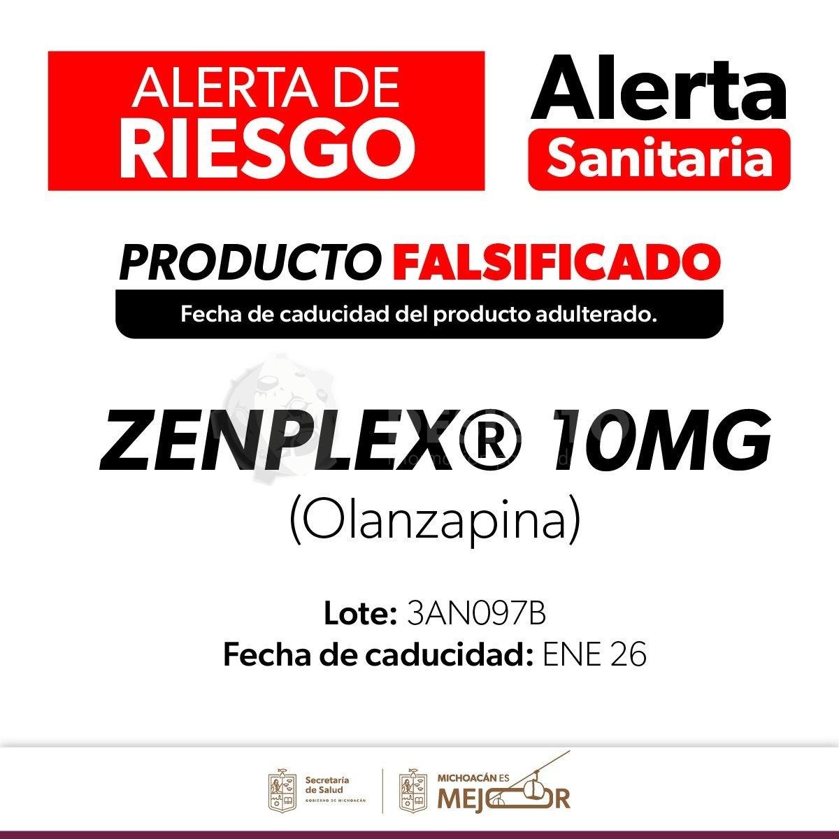 Morelia, Michoacán, 20 de enero de 2026.- La Comisión Federal para la Protección contra Riesgos Sanitarios (Cofepris), a través de la Secretaría de Salud de Michoacán (SSM), informa a la población sobre un aviso de riesgo sanitario relacionado con el medicamento Zenplex®️ (Olanzapina), en presentación de tabletas de 10 mg, correspondiente al lote 3AN097B.