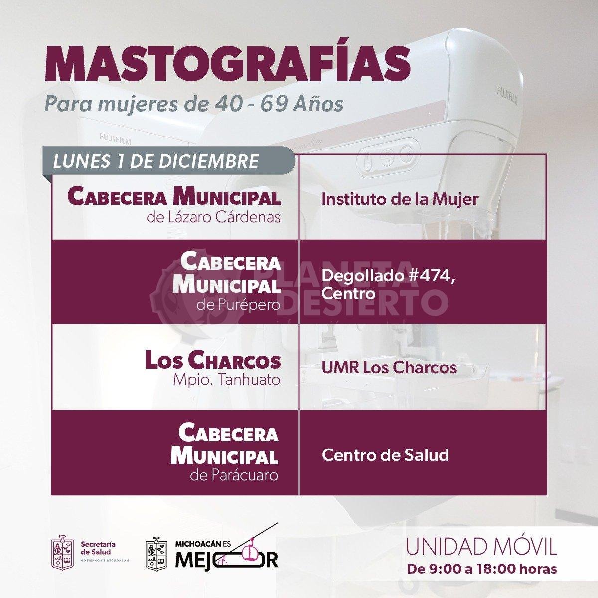 Morelia, Michoacán, 29 de noviembre de 2025.- Durante diciembre, la Secretaría de Salud de Michoacán (SSM) continúa con las acciones de detección oportuna del cáncer de mama en mujeres de 40 a 69 años, con el despliegue de unidades móviles de mastografía en 10 municipios del estado.