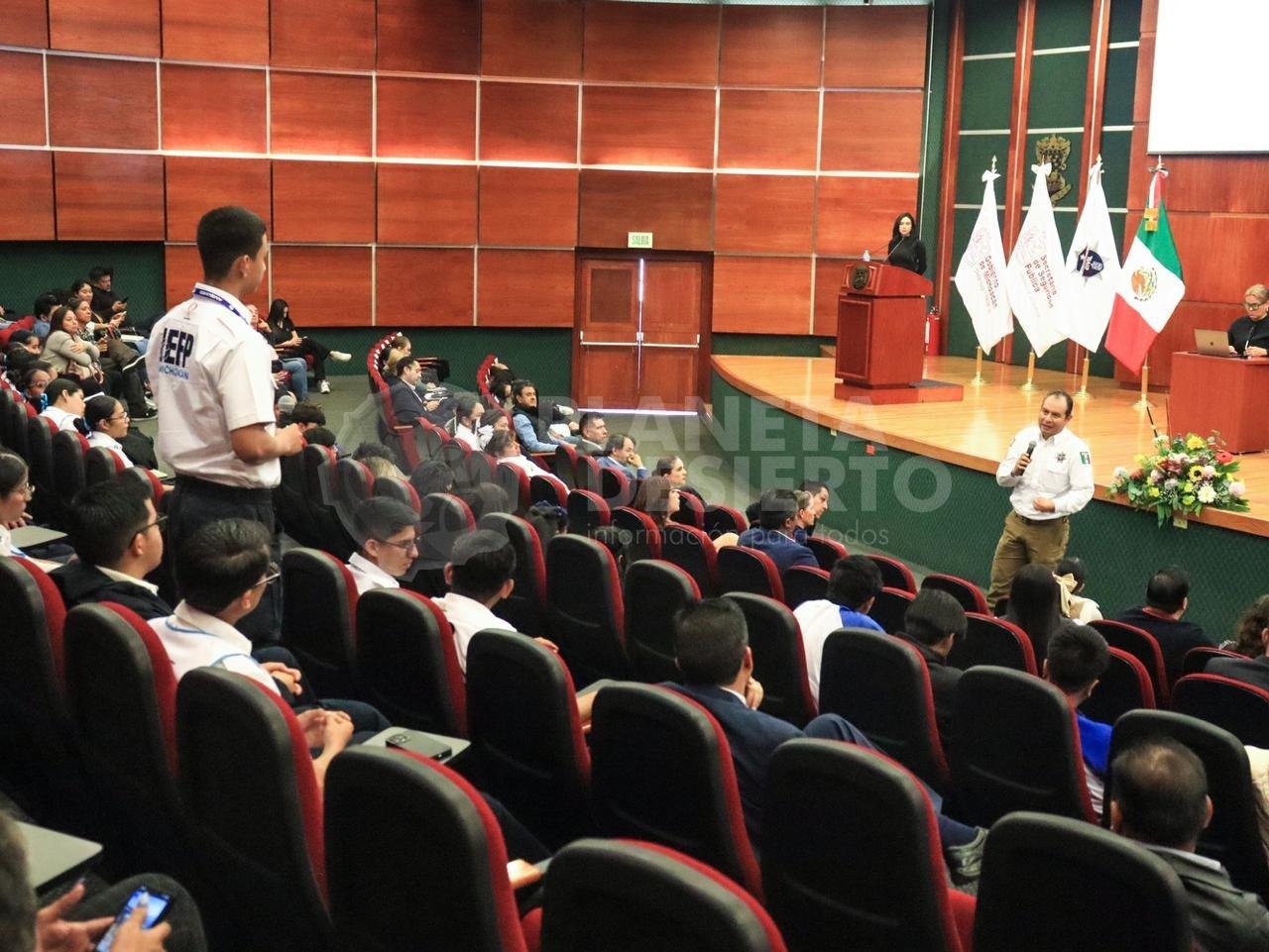 Morelia, Mich.- 4 de noviembre de 2025.- Con el objetivo de fortalecer las acciones de prevención, atención y denuncia del delito de extorsión, la Secretaría de Seguridad Pública (SSP), a través de la Subsecretaría de Investigación Especializada (SIE), organizó el Primer Foro Estatal contra la Extorsión, realizado en el auditorio del Palacio de Justicia “José María Morelos”, en la capital michoacana.