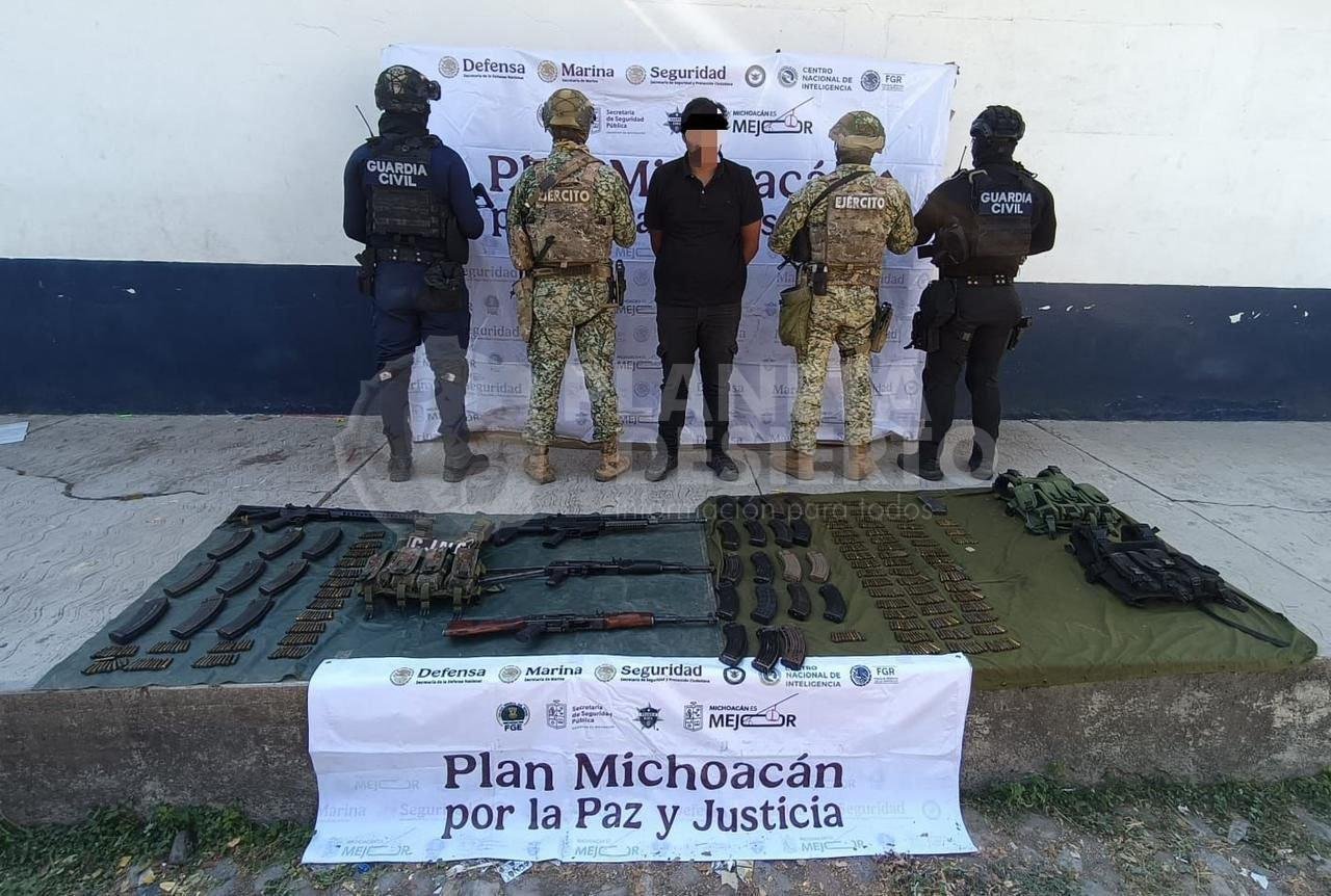 Apatzingán, Mich.- 20 de febrero de 2026.- Como parte del reforzamiento del Plan Paricutín en Apatzingán, elementos de las secretarías de Seguridad Pública (SSP) y de la Defensa Nacional (Defensa) detuvieron a un hombre en posesión de cuatro fusiles, 714 cartuchos útiles, 29 cargadores, chalecos tácticos y un vehículo con reporte de robo.