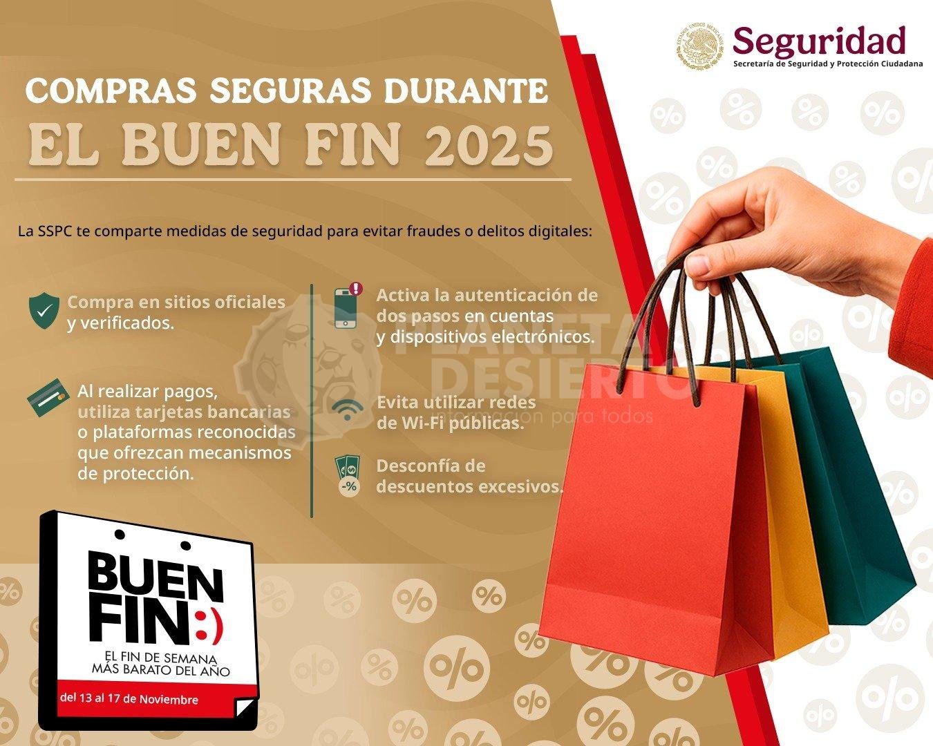 La Secretaría de Seguridad y Protección Ciudadana (SSPC), a través de la Unidad de Inteligencia, Investigación Cibernética y Operaciones Tecnológicas, invita a la ciudadanía a tomar medidas de seguridad y evitar ser víctima de fraude u otros ciberdelitos durante el Buen Fin 2025.