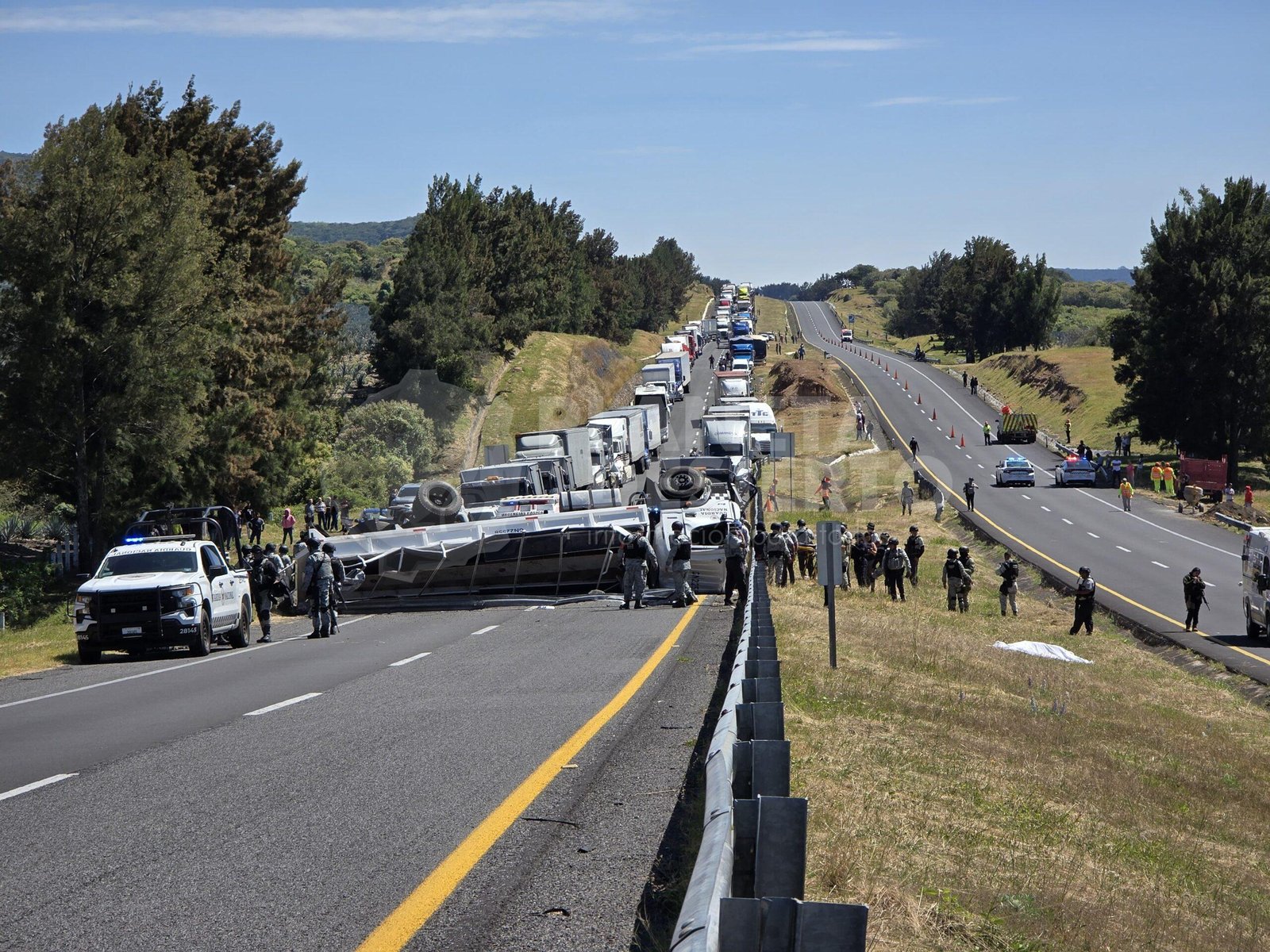 Churintzio, Mich.- 23 de octubre de 2024.- Suman tres oficiales de la Guardia Nacional fallecidos tras un trágico accidente ocurrido en la autopista México – Guadalajara, donde un camión tipo “Mercedes” volcó, en el sitio murieron dos de los uniformados, otro más en un hospital y hay 19 lesionados.