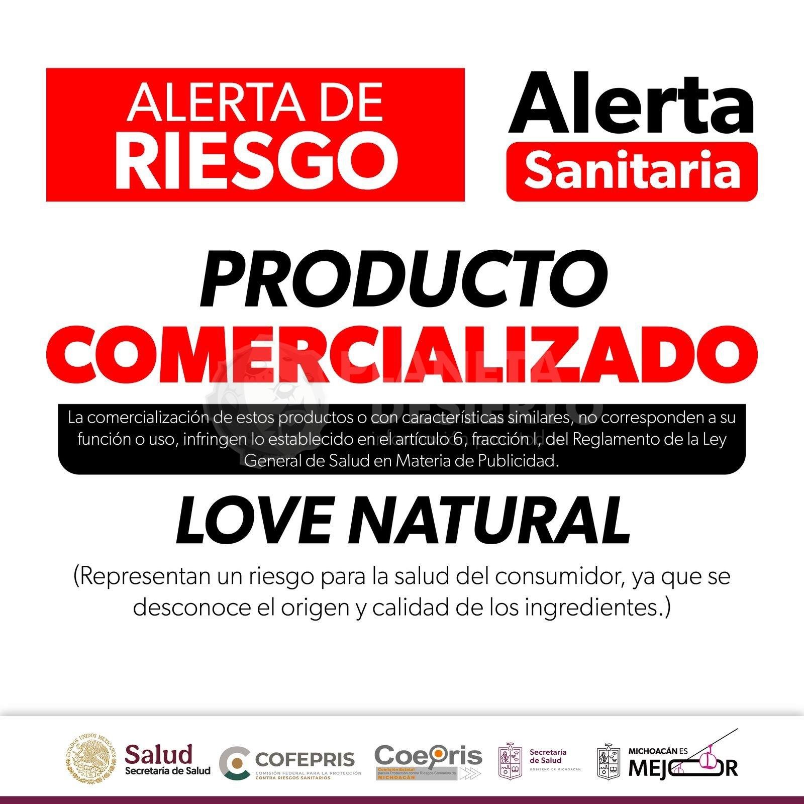 Morelia, Michoacán, 8 de diciembre de 2025.- La Comisión Federal para la Protección contra Riesgos Sanitarios (Cofepris), a través de la Secretaría de Salud de Michoacán (SSM), alerta a la población sobre el riesgo sanitario de los suplementos alimenticios Love Natural, los cuales se comercializan sin cumplir la legislación vigente, representando un peligro para la salud.