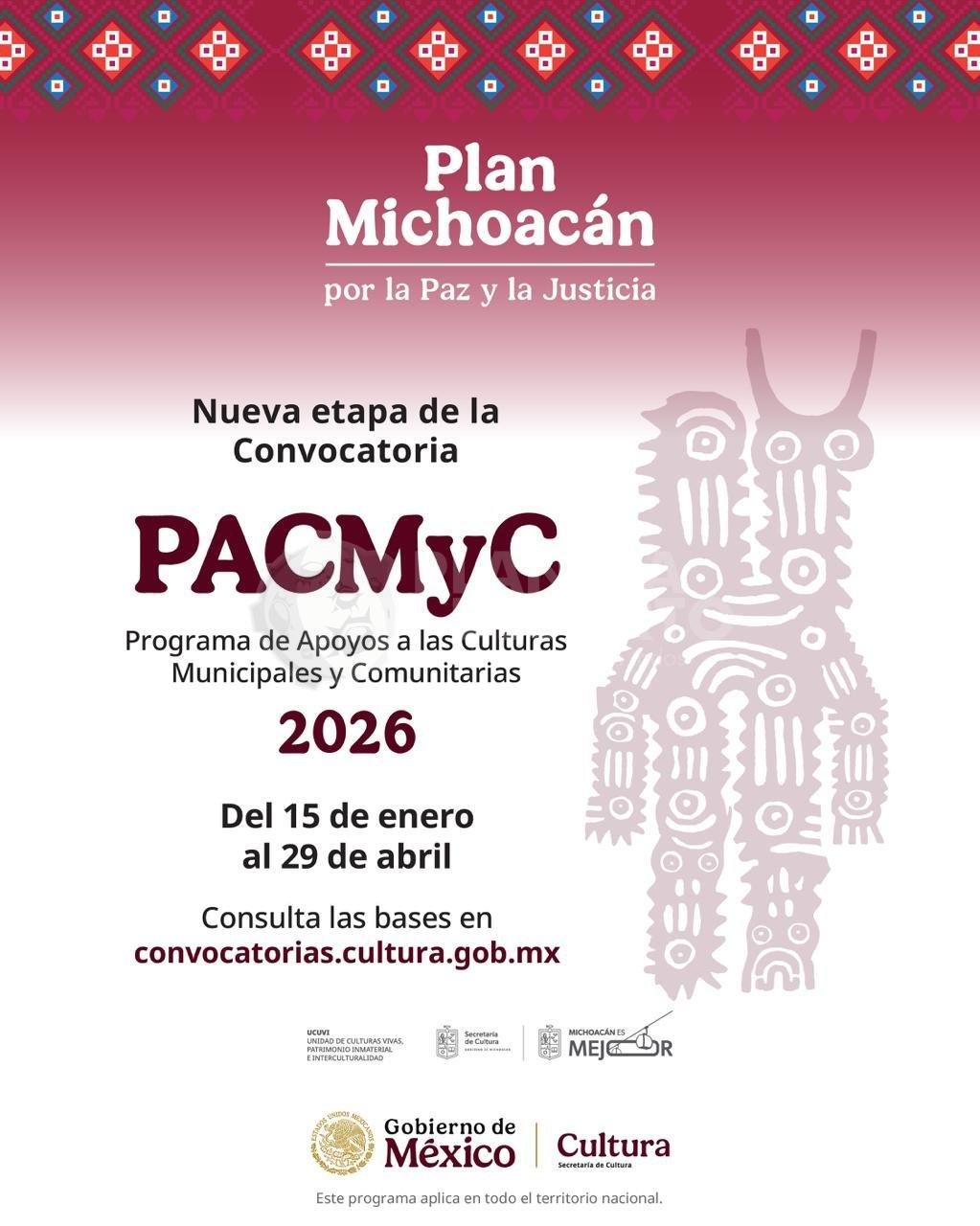 Morelia, Michoacán, 8 de febrero de 2026.- En el marco del Plan Michoacán por la Paz y la Justicia, la Secretaría de Cultura estatal, en coordinación con su homónima federal, destinarán seis millones de pesos a través de la convocatoria del Programa de Apoyos a las Culturas Municipales y Comunitarias (Pacmyc) 2026, para facilitar la participación de proyectos culturales en comunidades de la entidad.