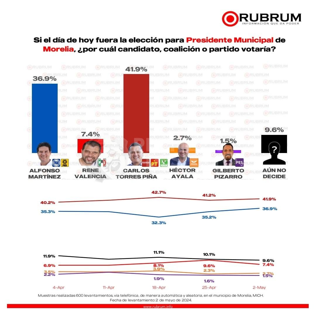 Si hoy fueran las elecciones por la presidencia de Morelia, el morenista Carlos Torres Piña se convertiría en el próximo alcalde de la capital michoacana, según expone una encuesta realizada por Rubrum.