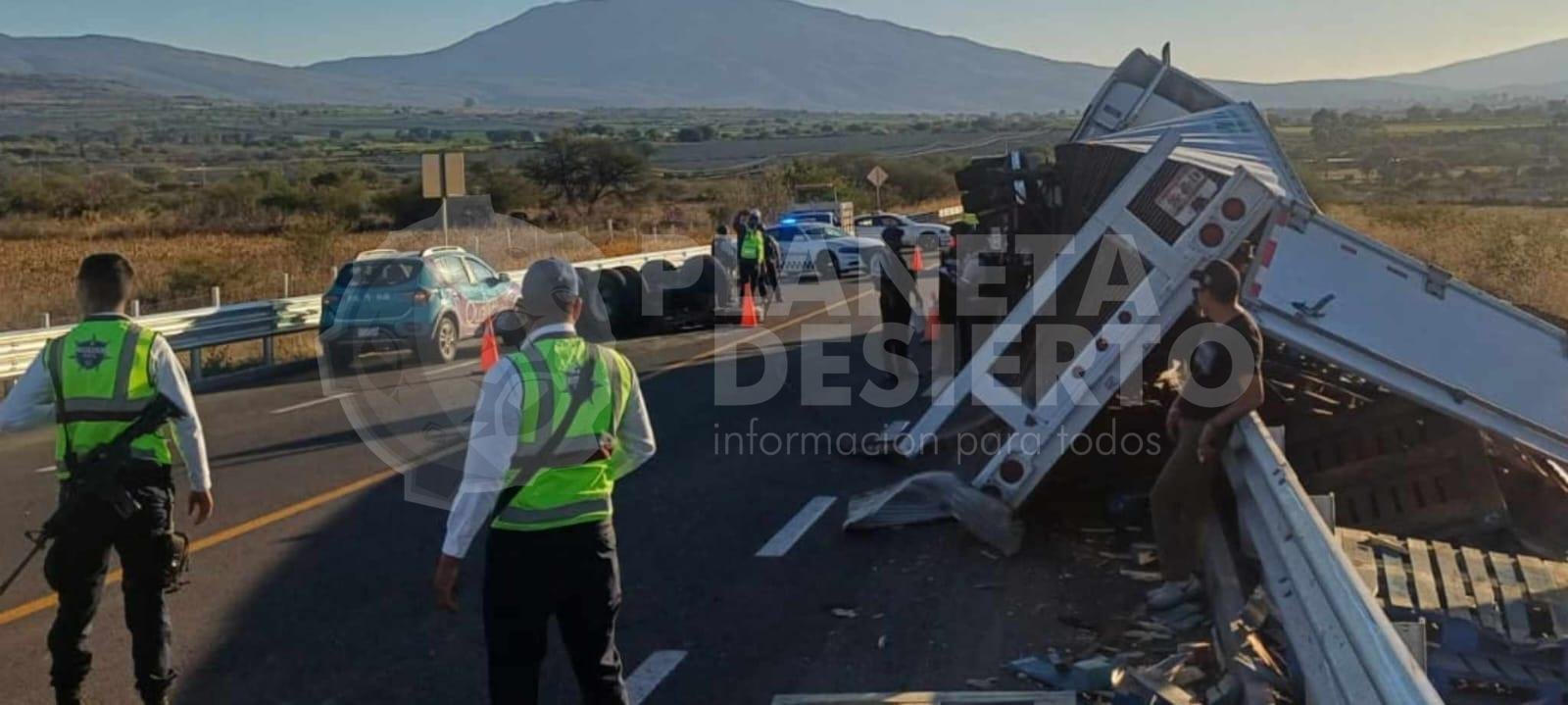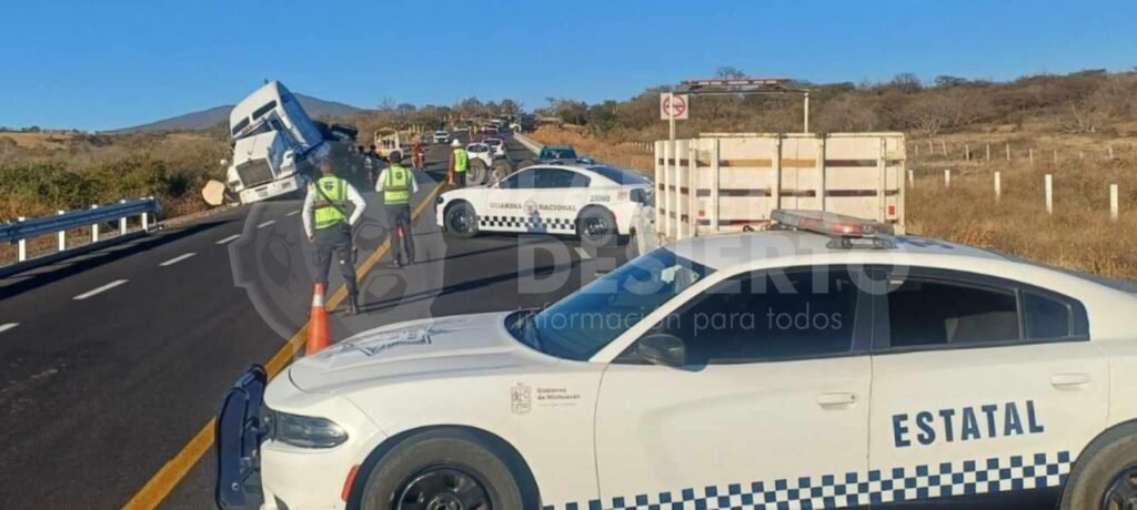 Ecuandureo, Mich.- Martes 6 de febrero de 2024.- Un tractocamión se accidentó en la carretera Ecuandureo-La Piedad en este municipio, sin que afortunadamente hubiera personas lesionadas que lamentar, hecho que fue atendido rápidamente por las autoridades viales.