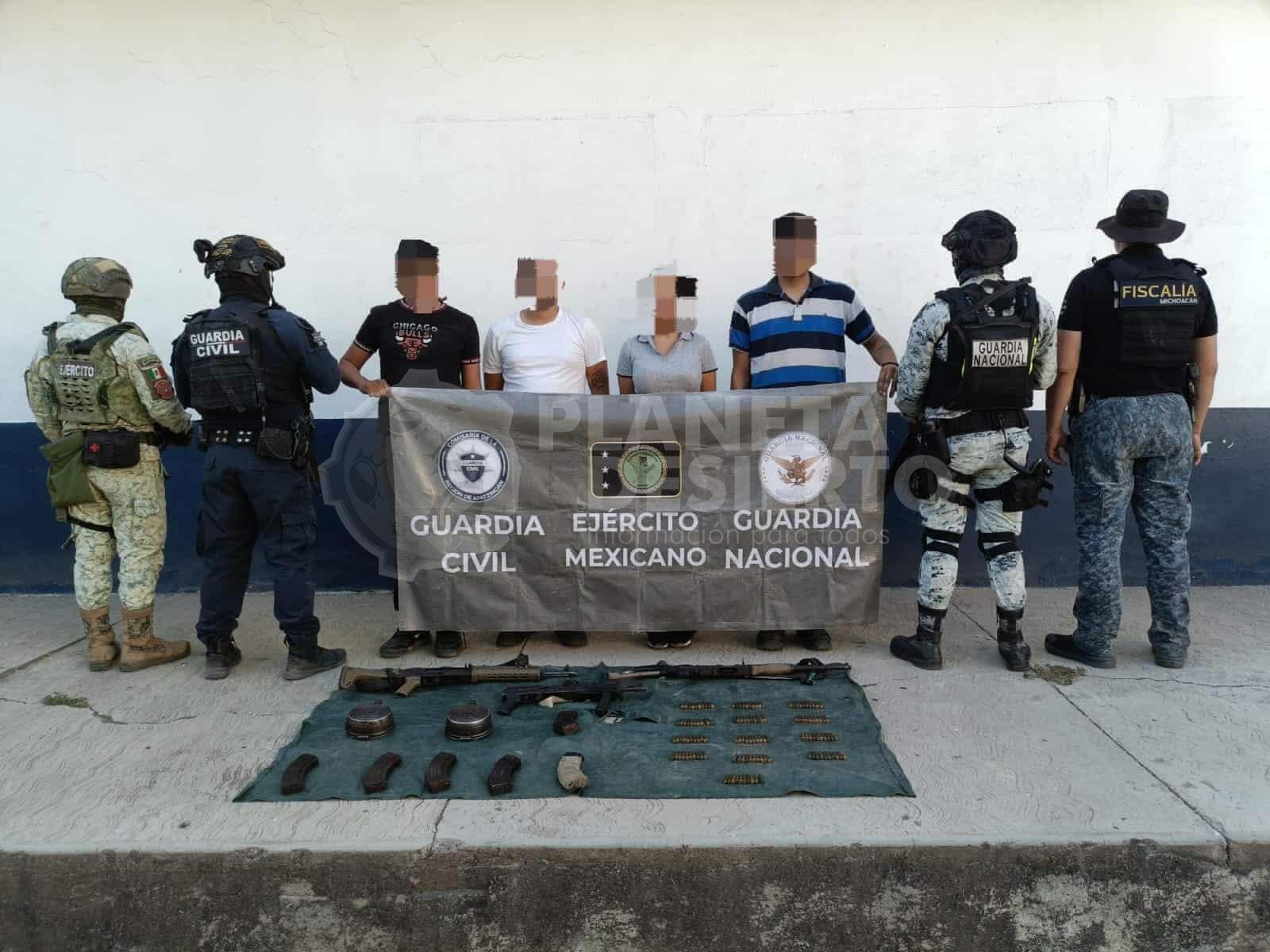 De inmediato se los uniformados repelieron, arribando al sitio personal de apoyo por tierra y aire, lo que permitió la detención de Kevin S., alias “El Búho” de 23 años de edad, Miguel Ángel A., “El Cucú”, de 18 años y Rafael U., de 17 años de edad, todo ellos originarios de Múgica, así como Mayra Betsaida C., de 31 años, esta última originaria de Uruapan.
