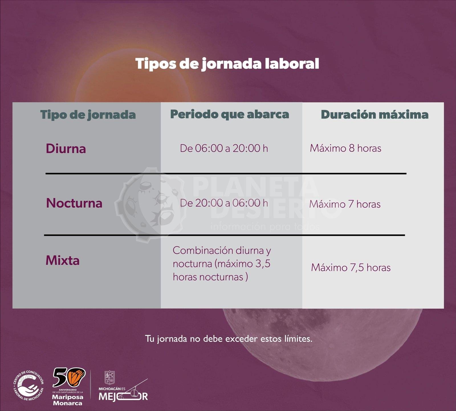 Morelia, Michoacán, 21 de febrero de 2025.- Conocer la duración de la jornada laboral es fundamental para que las personas trabajadoras puedan exigir el respeto a sus derechos. El Centro de Conciliación Laboral del Estado de Michoacán (CCL), dirigido por Andrés Medina Guzmán, ofrece asesoría gratuita para que las y los trabajadores tengan claridad sobre los horarios permitidos por la ley y el pago correspondiente en caso de excederlos.