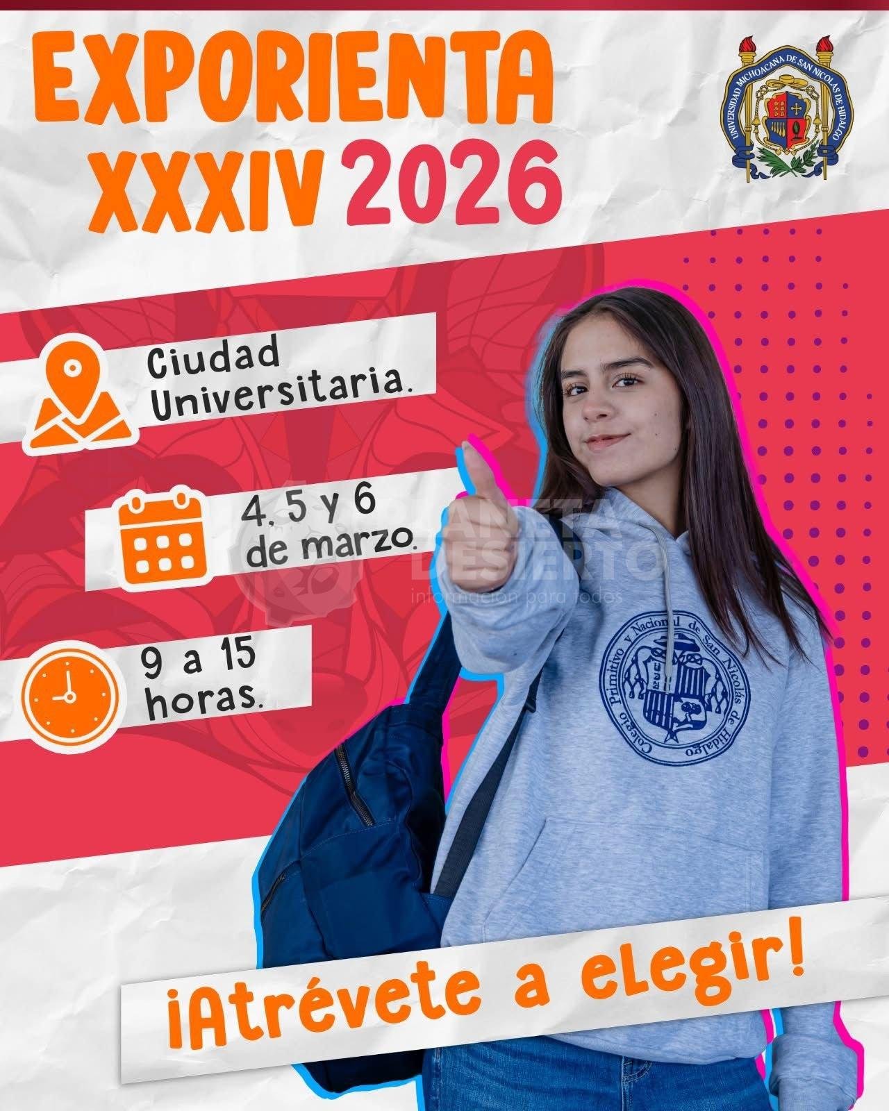 La ExpOrienta 2026 se realizará los días 4, 5 y 6 de marzo en las instalaciones de Ciudad Universitaria de las 9:00 a 15:00 horas, es un evento totalmente gratuito para estudiantes del bachillerato nicolaita, de escuelas incorporadas a la UMSNH, estudiantes de otras instituciones educativas de Morelia y del interior del estado, así como público en general.