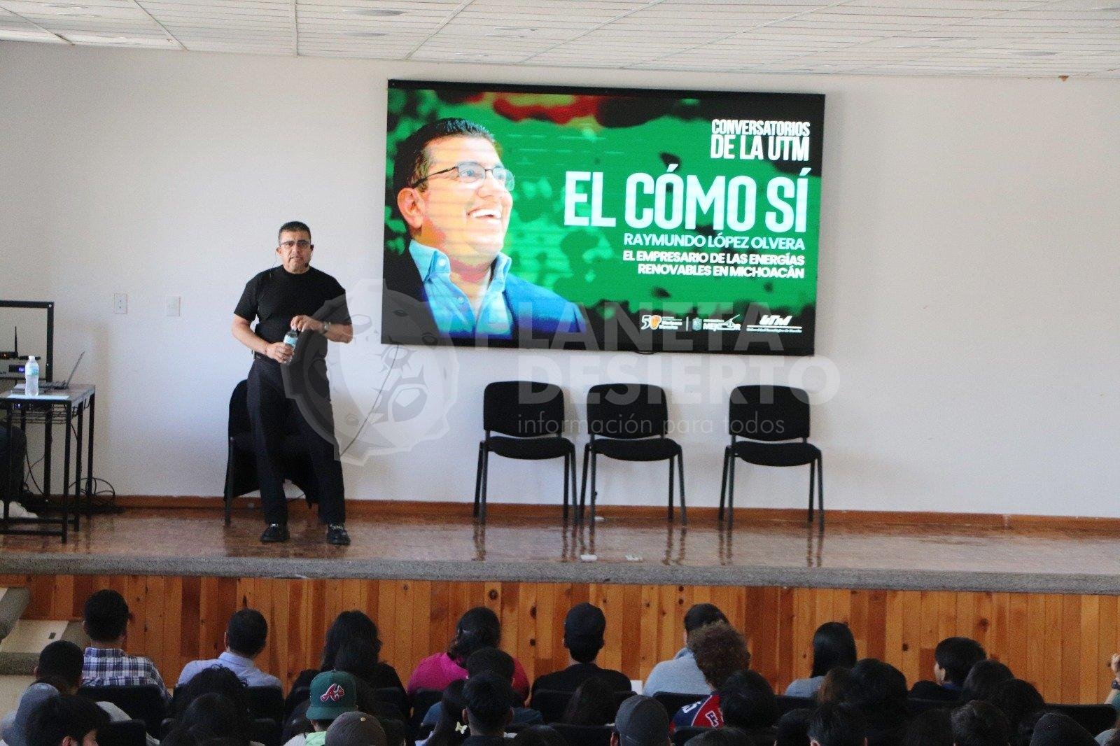 Durante la conferencia, López Olvera expuso su experiencia profesional en los sectores de energía renovable, vivienda y ecología, así como los retos que enfrentó en su trayectoria empresarial. Explicó cómo identificó oportunidades de crecimiento y desarrollo en Michoacán a partir de la innovación tecnológica y el aprovechamiento responsable de los recursos.