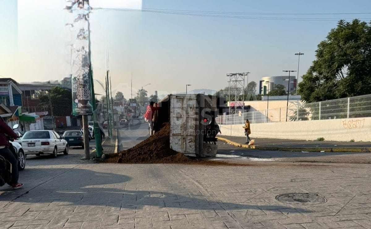 Vuelca volteo frente a Wal-Mart, en el Fraccionamiento Villa Uruapan